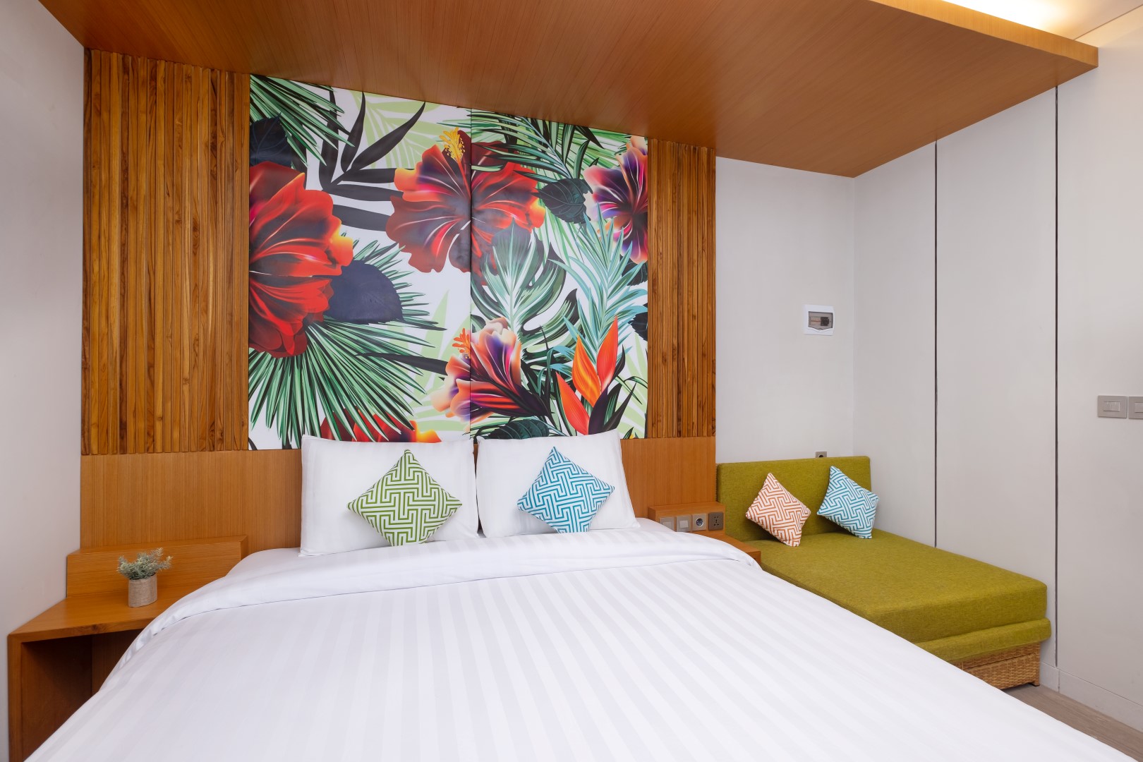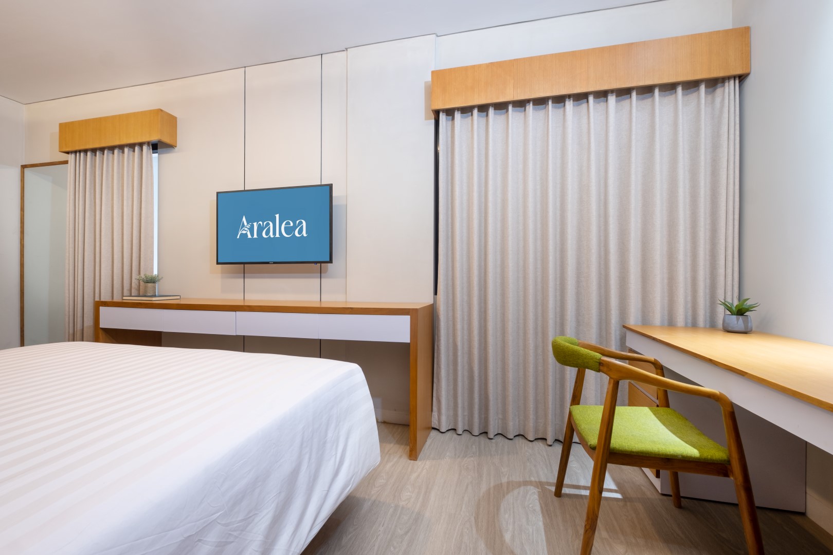 The private space of your own offered at affordable price. Superior room is mainly set up with double bed, writing desk, and enclosed bathroom with rain shower. Furniture neatly placed in the room are the shade of green, white, and brown, bringing peace to your vision.